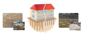 これに対して、少し高価にはなりますが液状化に対応する「砕石パイル式」という改良方法があります。杭状に穴を掘って砕石を充填して、表層にも砕石を敷き詰めるものです。液状化は強い揺れによって水と砂が分離して起こるのですが、揺れで水圧がかかった時にこの砕石で出来た通路を水が通って逃げるので、液状化が起こりにくいという仕組みです。