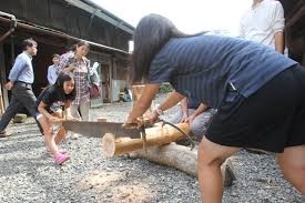 大鋸とはこの写真のような形をして、長さ約2m幅5㎝で中央で刃の向きが左右に分かれていて写真のように2人で引いて使いました。これは横引きに使っていますが、日本に伝わった最初は縦引きの鋸です。