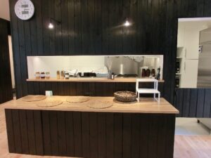 肝心なデイサービスのメインである食事のことですが。ここの厨房は、ホールにいる人たちから内部が見えるようにオープンキッチンの形式を取り入れているため、自分の食べる食事を調理人が作っている様子が見えて、ちょっとおしゃれなレストランで食事をしている気分が味わえるのではないかと思います。厨房の中は結構広くて大きな冷蔵庫や冷凍庫、大型ガスコンロが入っていて30人分の食事を造ることが出来るそうです。