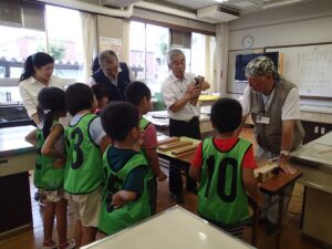 鉋くずの匂いを子供たちにかいてもらい、檜のちょっとピリッとした味と、杉の優しい味わいの違いを感じてもらえたのではないかと思います。鉋くずは少しずつ袋に詰めて持ち帰ってもらい、檜はお風呂に入れて檜風呂の香りを・・・杉を持ち帰った子供には日本酒の熱燗に入れてお父さんに樽酒の香りを楽しんでもらってみては、と声を掛けました。子供たちの感想は聞けていませんが、家族で楽しい会話が弾んだのではないかと想像しています。