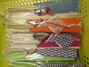 箸作りの順番を待っている間、子供たちはすくすくスクールのスタッフさんの牛乳パックを芯に使った箸置きと千代紙の箸袋をあわせて作りました。それもなかなかおしゃれで、箸入れに入った箸は素敵なプレゼントになるような仕上がりでした。