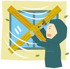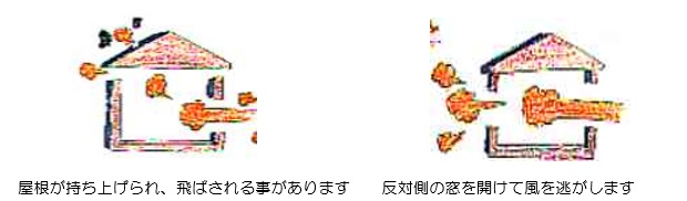 台風が来て窓ガラスが破られるようなことがあった場合は、内側から畳や板などでふさげる場合はふさぎます。しかしそのような対策が取れないような場合は、屋根や天井の吹き上がりを防ぐため反対側の窓を開けて風を通り抜けさせることも被害を少なくする方法としては有効です。