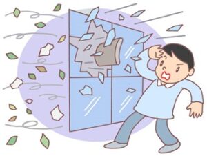お客様から窓が割れることはないかとのご心配の声を聞きますが、窓ガラスも風では割れないように厚み等の基準があります。ただ物が飛んできてぶつかれば割れますのでその時の対策はガラスにテープを貼り割れても飛散しないようにすることや窓ガラスの大きさにダンボールを切って貼る、カーテンが有れば閉めておくことなどの対策を取りましょう。