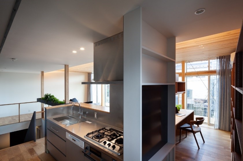 リビングの一角にはワークコーナーを設けご主人は仕事を、子供は勉強が出来るようにしています。ご主人はコロナによる在宅勤務に大いに役立ったと喜ばれていています。