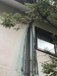夏が終わると次は台風シーズンに入りますが、先日写真のような家を見つけました。これは雨樋がつまり大きい雨の時に樋からはけきれずにあふれた水が外壁にかかっている状態です。ここまでになりますと外壁を汚しているだけでなく外壁自体を痛めている可能性があります。