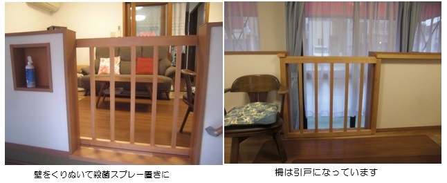 入口の仕切りの腰壁の一部を柵にして、ベットからも外が見られるように、部屋から車イスでも外に出られるように引戸にしました。入口の土間は段差解消機が取り付けられるスペースを確保してあります。