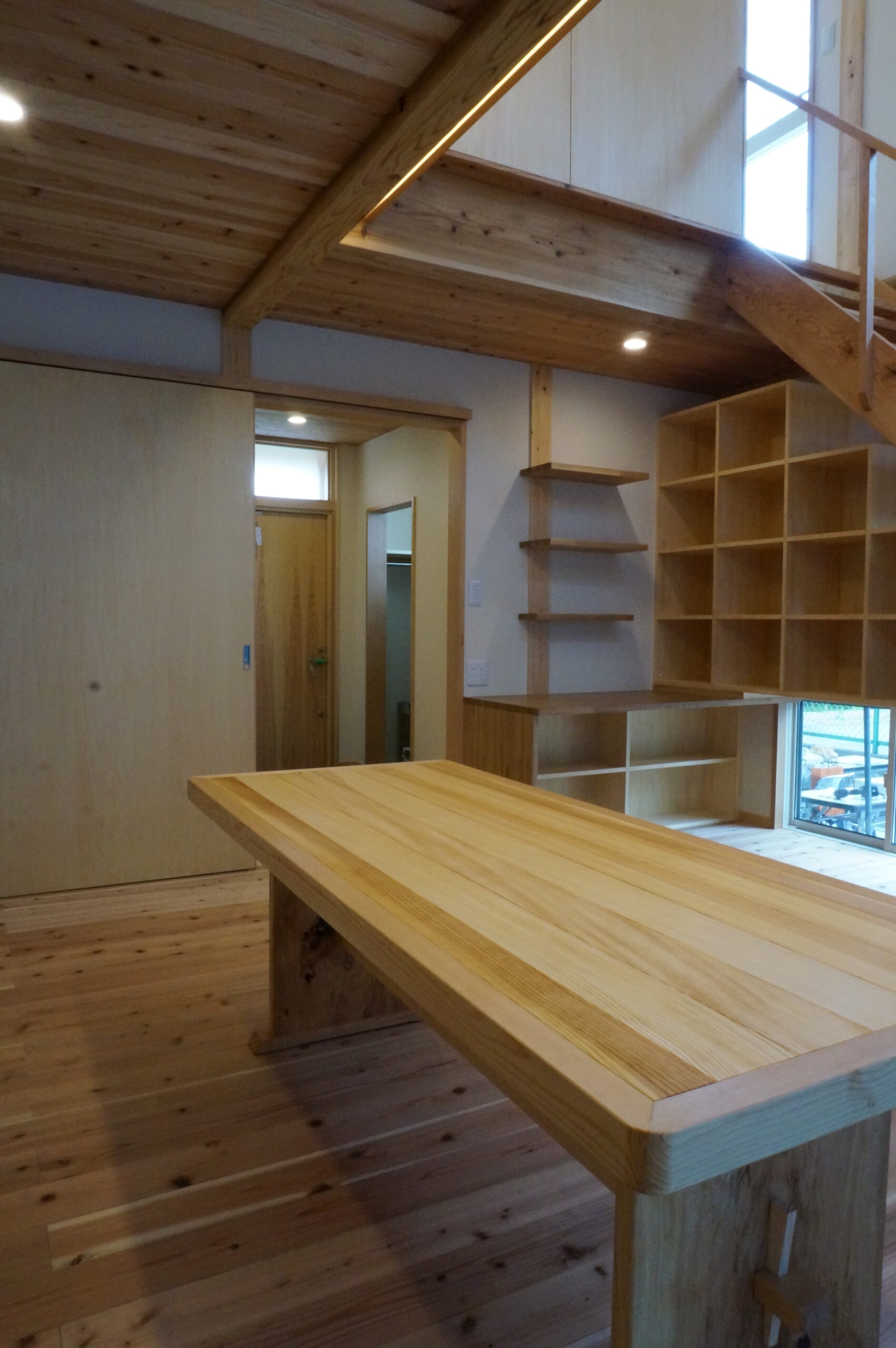 杉と檜を貼った天井や腰壁、床に、壁一面の棚と机、キッチンや洗面台など水回りまですべて手作りの木の作り付け家具をあしらい、家の中いっぱいに広がる木の香りが都会では感じられない空間を演出しています。