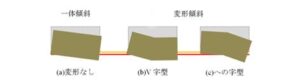 不同沈下被害の形態には上記2種類のタイプがありますが、戸建て住宅の場合は一体傾斜という形が多く、これは建物には変形がなく全体が傾くという被害です。