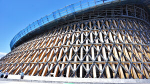 使用した木材の体積は約800㎥で、木材の強度が強い部分だけを選んで集成するということで、普通の木材を取る場合は丸太から製材品にする歩留まりは50%程度ですが、強度の強い部分だけを使うということで通常の数倍の丸太が必要になったと思います。